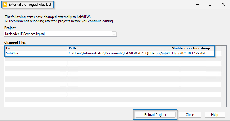 In LabVIEW 2026 Q1 Beta gibt es nun einen Dialog, der dich benachrichtigt, wenn geöffnete Dateien auf der Festplatte geändert wurden. Weiters gibt es eine schnelle Möglichkeit zum Neuladen deines Projekts.