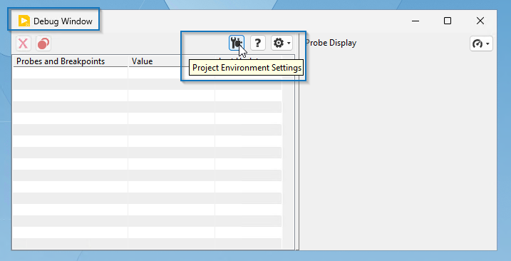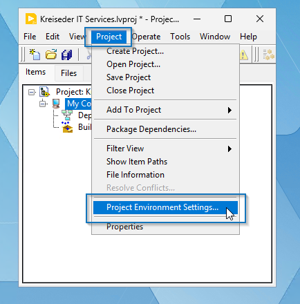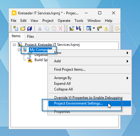 Der neue Dialog heißt Project Environment Settings. Es gibt mehrere Wege, diesen zu öffnen. In der LabVIEW Menü Leiste unter Project > Project Environment Settings. Rechtsklick auf ein Target, zb. My Computer > Project Environment Settings. Oder mit dem Button, Project Environment Settings im Debug Window (CTRL + D).