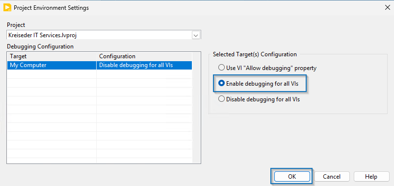 In LabVIEW 2026 Q1 Beta gibt es nun eine neue Funktion mit der du die VI-Eigenschaft „Allow Debugging“ innerhalb eines Projekts überschreiben kannst.