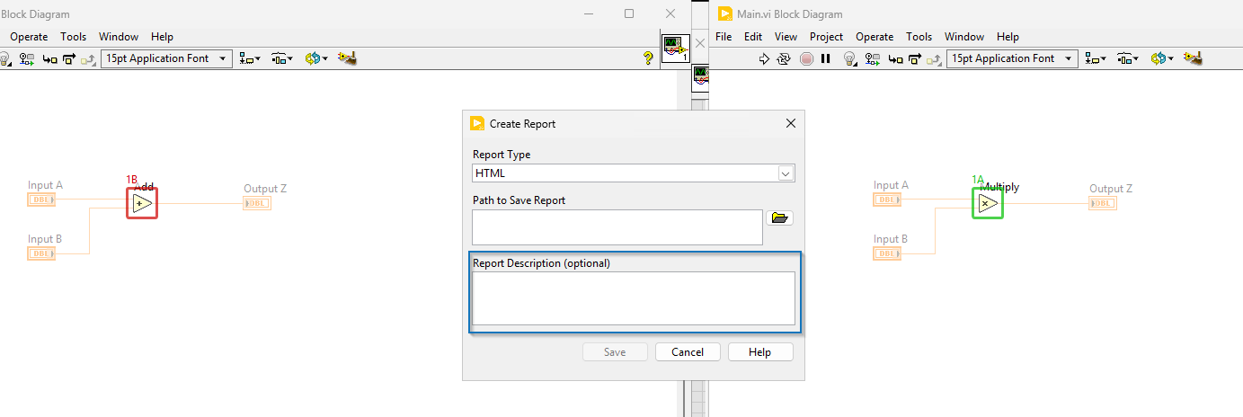 Beim Hinzufügen oder Entfernen von Objekten zeigen die linken und rechten Screenshots im VI-Comparison Report denselben Bereich des Front Panels oder Block Diagrams.